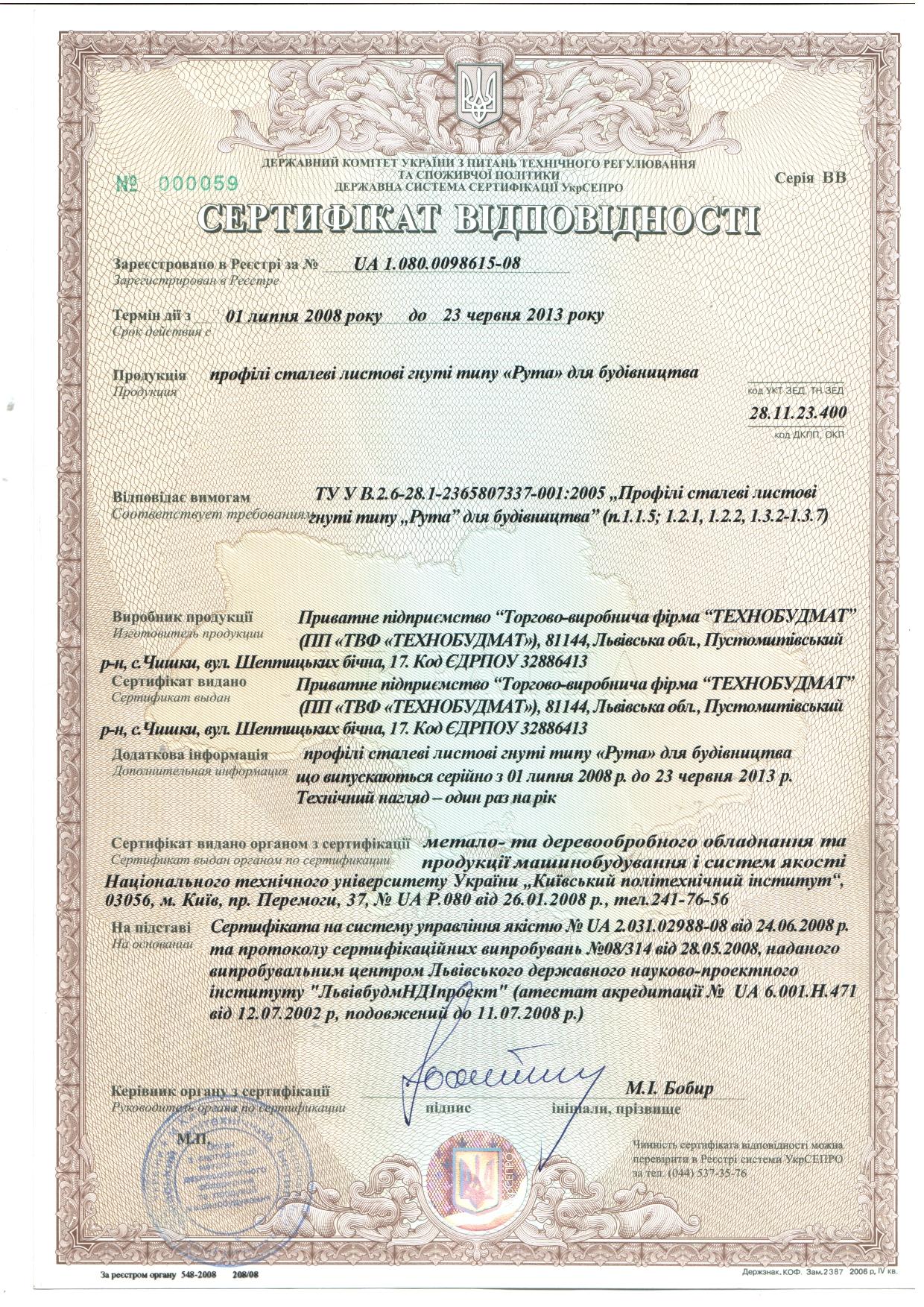 Сертифікат засвідчує, що продукція тм "Рута" відповідає вимогам ТУ У В.2.6-28.1-2365807337-001:2005